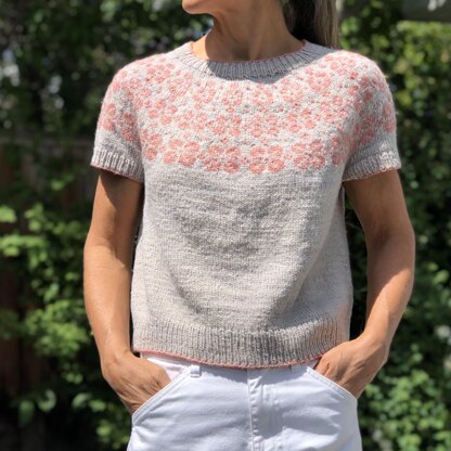 Early Bloomer can be knit in any DK weight yarn, and the instructions include both a short and long sleeve option. The body length is slightly cropped (11 inches / 28 cm) but can easily be lengthened or shortened. Note that for every additional inch of length, you will need about 5% more MC yarn (relative to the amount for the short sleeved version given below).