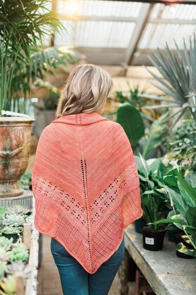 Lined with rows of delicate eyelet flowers, this simple triangular shawl is a beautifully easy accessory perfect for spring. Bands of drop stitch ribbing topped with a few rows of simple garter traces its way around the V-shaped edge, promising a delightful knit for new shawl knitters.