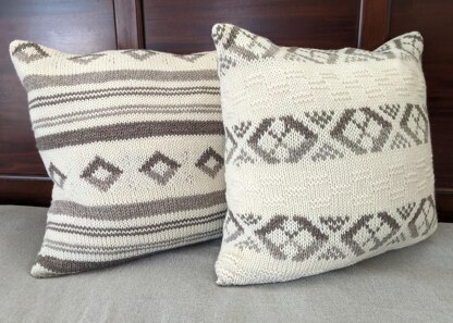 The Earthy Pillows are knit in the round, starting at the bottom. Work in Fair Isle pattern and finish with the main color. Then the pillows are finished off by turning them inside out and binding off using the Three Needle Bind Off. The zippers are sewn onto the Cast On edge.