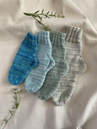 The Easiest Baby Socks are knitted in fingering weight (#1) yarn and can be made out of scraps of leftover sock yarn. One 100g skein of sock yarn will make 7 [5, 4, 3] pairs of socks.