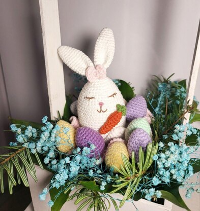 Lovely egg-shaped bunny in a pink basket with colored Easter eggs. Just right for any Easter table.