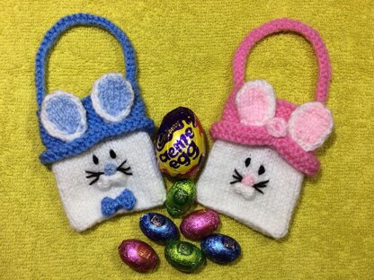 This knitting pattern is for two gift bags as a girl and boy Easter bunny.