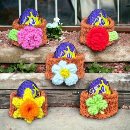 This knitting pattern is for a Easter Flower Pot holders to hold eggs. The set includes how to make a carnation, rose, daisy, clover and daffodil.