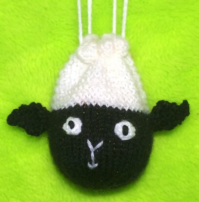This knitting pattern is for a drawstring gift bag in the shape of a lamb's face.
