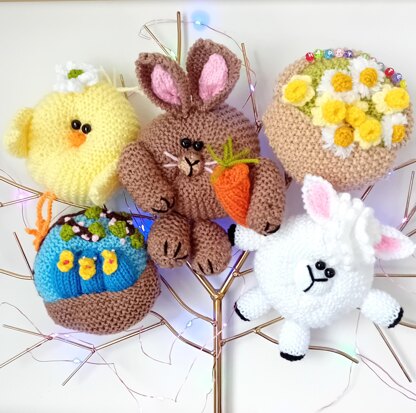 Knit one basic shape then adapt it to create Easter Bunny, Chick, Spring Lamb, Bird nest & Flower basket.