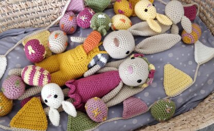 Complete set of Easter Amigurumi PATTERNS Included patterns: !! Sizes using Aran weight yarn and 5.00 mm crochet hook !! - Rose Rabbit - about 38 cm long - Peter Rabbit - about 50 cm long - Easter Eggs - about 7 cm long (little bunnies are about 12 cm long) - Garland - each triangle is about 9 cm long (final size will depend on the spacing between triangles and number of triangles used in total) The patterns are written in English (US) using US terminology.