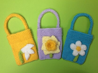 This knitting pattern is for three gift bags with a snowdrop, daffodil and daisy on.