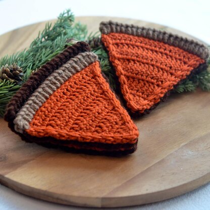 This pumpkin pie coaster pattern includes a “crust” holder and two “pieces of pie” coasters. The crust holder can also be used as a third coaster. When not in use, the two coasters stack up neatly on the crust holder. Together, they look like a thicker slice of a pie.