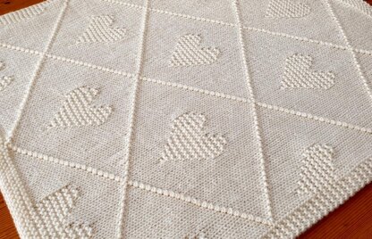 A easy knit baby blanket with a classic heart and diamond pattern.