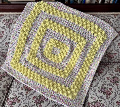 This playful baby blanket is full of texture and colorful delight for the baby's fingers and eyes! It is also an excellent way for a confident beginner to learn the seed stitch and the popcorn stitch. A complete video tutorial is included.