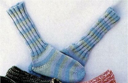 A wonderful, easy pattern, just made for lounging around the house. These also are good in boots in very cold climates. A very easy heel shaping, with socks being knit on an 11 inch circular or, double points, US size # 8. Use worsted weight yarn , and make lots of these to slip on after you come home from work at night!