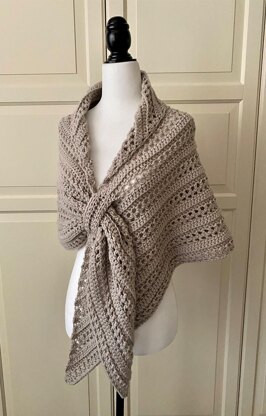 - 13.5 oz / 855 yds Loops & Threads Impeccable yarn, color: PUTTY. Any worsted weight will do. Shawl's fastening strap is attached via whipstitch.