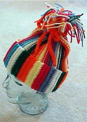Beginner easy, and reversible! This is a fun project for the children that are learning to knit! They can get creative and use up lots of bright colored yarns! Knitting is easy, and they can watch the colors grow while working on it! Uses scraps of worsted weight yarn, and knitting needles, US # 10.5. Use # 9 needles for tie, or use a ribbon for tie. One size fits from children to adults.