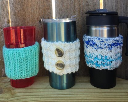 Perfect for that “to go” coffee everyone picks up at the local coffee shop! These make great gifts to go along with a new coffee mug or a gift card to a favorite coffee shop! These sleeves also work well for those who like hot tea or hot cocoa. Uses minimal amounts of worsted weight yarns, so knitting is quick and easy! Make all 3 styles and have on hand at your home or for gift giving. Fun to make, and a very stylish way to drink your coffee or hot tea! The checks and stripes design can be made larger to fit over those “super sized” mugs or coffee drinks! US # 8 needles.