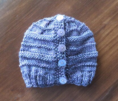 Overview: The hat is worked flat and the button bands are worked right along with the main part of the hat so there is no seaming and no picking up stitches. The buttons allow you to wear a ponytail high, low, or in between - perfect for walking the trails (or the dog!).