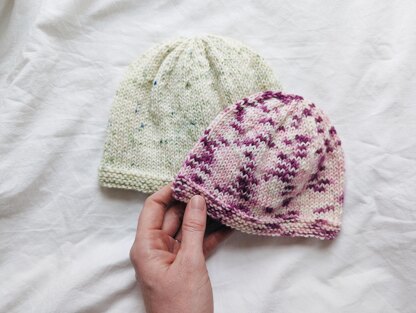 Knit in DK yarn, this hat is knit flat and seamed. The hat comes in sizes newborn all the way to toddler size (1-2 years).