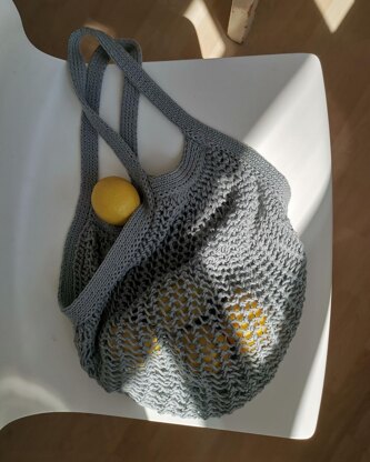The bag is knitted in a simple lace pattern with yarn overs. First, the mesh is worked flat, then the bag gets its shape from the border. The pattern contains two variants, the basic variant with a border worked in garter stitch and a new, very nice alternative variant with a rib border.