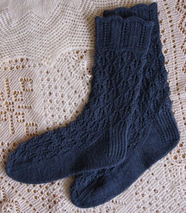These top-down socks have some stocking flair, featuring a lace cuff with built-in calf shaping. A related lace pattern continues down the leg, instep, and optionally all the way to the tip of the toe. The two patterns have delayed decreases in common: the yarn overs are set several stitches away from their corresponding decreases, which shapes the fabric into zigzags and ripples that cling comfortably to your foot.