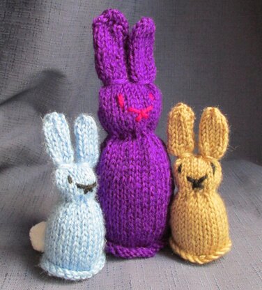 Little knitted bunnies to sit over chocolate eggs for novelty Easter presents and to sell as fundraisers. The smaller bunny will make a finger puppet when the egg is eaten, the larger one will make an egg cosy or a hand puppet for a small child. Quick and easy to make – suitable for beginners.