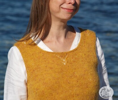 Design details: ● vest with lace pattern ● seamless, worked in one piece ● worked from the bottom up to the underarm in the round ● small lace patterns on shoulders, front and back neck ● darts for Sizes S – XL ● short rows shaping