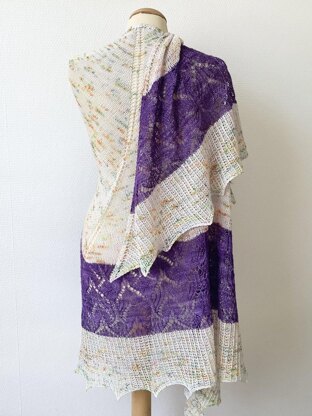 The Electric Violet shawl, was inspired by the gorgeous hand-dyed yarn from RMR Yarn Co. it’s knit with. It combines a relaxing-to-knit stockinette body, with a delightful lace section, followed by a twisted rib edging. The shawl as shown in size L, uses 300 g of fingering weight yarn. A smaller 2 skein shawl (size S in this pattern) is made by omitting the twisted rib section.