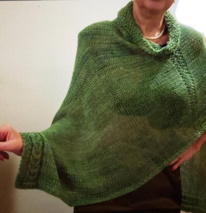 A pretty asymmetrical poncho, accented with a side cable, seed stitch, and sporting a slouchy collar. Shown in a silk/merino DK-weight yarn, this poncho would be equally pretty in a sports weight, or serve as a suitable outdoor garment in worsted. Easy to knit, with only one cable, and easy to finish.