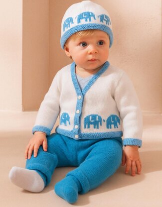Knitting pattern for a cute Elephant Outfit for babies and toddlers aged birth to 18 months.