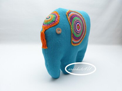 I used Catania-cotton and a hook size 3 mm. It took 260 grams + leftovers for the decorations. This way the elephant measures 38 cm by 44 cm.