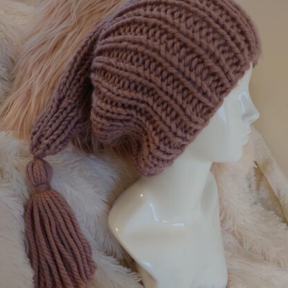 tasselled hat Knitted in simple rib, in the round, this long hat is finished with a large tassel.