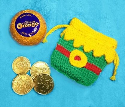 This knitting pattern is for a festive drawstring gift bag in the shape of an elf's clothing.