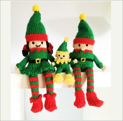 Christmas Elf family - go for the cutest elves this Christmas: boy, girl and baby. knit with DK yarn on 3.25mm straight needles Ideal for sitting on a shelf or decorating the Christmas table. There are no fasteners/buttons/sew on eyes so child safe. Each toy uses between 10g -28g DK yarn, knit on 3.25mm straight needles. The baby elf is approx. 12cm tall The girl and boy are approx. 23cm tall.