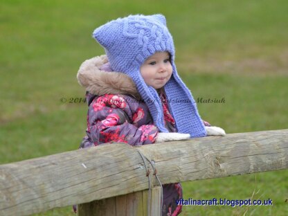 Elfin Story Hat is stylish and cozy accessory for the winter time. It is knitted in the round in garter stitch with cable pattern at the front and long earflaps for extra warm and comfort.