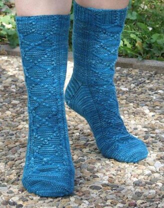 Inspired by laced boots, these socks are worked cuff-down in a cabled pattern. The back of the sock features a "fake seam" and the foot length can be easily adapted as needed.