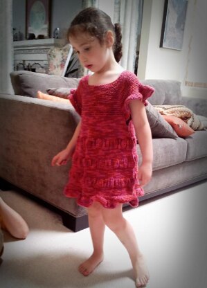 This sweet dress looks like an old-fashioned pinafore, but it has the simplicity and ease of today’s lifestyle. It features a garter stitch yoke, and the body is done in stockinette stitch with “stripes” of ruching in reverse stockinette stitch. The sleeves and hem are accented with pretty ruffles. It is knitted in the round so there are no seams to sew up. It's reversible too!