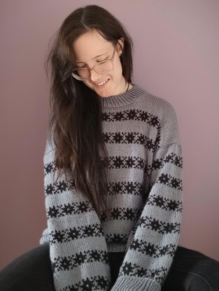 What makes the ultimate comfort knit? What draws you back to that one project day after day? For me, it has to be something engaging but not fiddly, something that feels good in your hands, and something that you are really excited to use once it’s finished… Believe me when I tell you this is that project! The colourwork bands feature a simple repeated motif that is easy to memorise and super relaxing to chip away at. Plus, considered design features like the folded cuffs and deep hem add to the cosy vibes which will have you yearning to complete your sweater so that you can wear it.