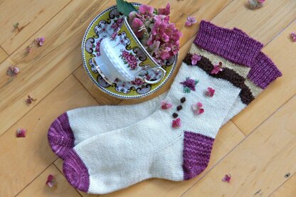 Elizabethan Rose is a cuff-down sock that features a delicate lace border followed by a rosette and bobbles that mimics the design of a dear friend’s teacup. This fun and whimsical design is the perfect pattern to use up some of those scraps in your stash, while also creating something beautiful.