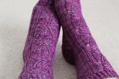 These cuff-down socks begin with twisted ribbing, which transitions into a delicate, feminine, leaflike lace pattern on the front of the leg and stockinette on the back. Using relatively easy decreases and yarnovers, the lace pattern moves quickly down the leg, leading to a traditional heel flap and gusset. The foot is completed with a wide toe that is grafted.