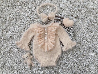 Eloise 4 piece romper set in newborn/21-22 inch reborn size. Set includes Ruffled collar romper, headband and heart lovie.
