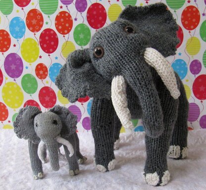This is Elsie Elephant and her baby Elvis. Elsie is knitted in dk on 4 mm needles and stands at 25cm high and 30 cm long. Elvis is knitted in microknit format in no8 perle cotton on 1.2 mm needles and he is just 10 cm high and 15 cm long. You can buy the Elsie Elephant and Baby Elvis knitting pattern on Etsy, Ebay or from my elephantastic website www.madmonkeyknits.com. Thanks for looking.