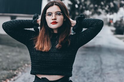 The Elvira Raglan is a top down, seamless cropped sweater with dramatic ruffle sleeves!