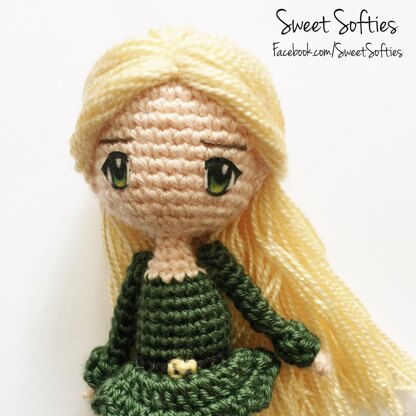 Elvira the Woodland Elf pattern provides full instructions for making a lovely elven doll, her accessories, anime-style eyes, and beautiful hair! She wears a little, green dress over a pair of laced over-the-knee tan boots. Elvira’s dark brown hooded capelet (mini cape!) also helps her blend into her woodsy surroundings. Like every elven member of her clan, she never leaves the security of her home without her trusty bow, arrows, and quiver.