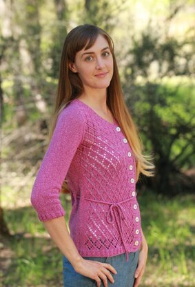 Elwell Cardigan is a vintage inspired raglan cardigan worked in a sport or light dk weight yarn from the bottom up. Mirrored lace patterns adorn the front panels and a flattering v neck completes the sweet and fun look. With a variety of options to choose from, ranging from standard waist shaping or a straight silhouette with a mid-back eyelet row and accompanying i-cord waist tie, to ¾ length or long sleeves, it’s versatile and easy to customize for personal preferences and fits.