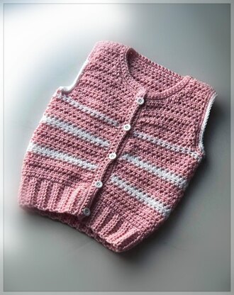 It is a front open, round neck vest available in sizes ranging from 3 months to 24 months.