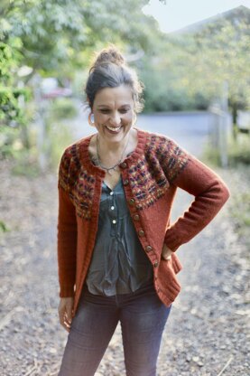 Embers is a stunning colourwork DK cardigan (using just two colours per round) for days when our sparks of creativity smoulder brightly. She’s knitted from the top-down and in the round, then steeked up the centre front to form a cardigan.
