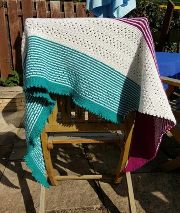 A good sized shawl in 3 colours of Worsted weight yarn. I knitted the sample in Cascade 220 superwash for a comfy, soft and squishy shawl for winter use.