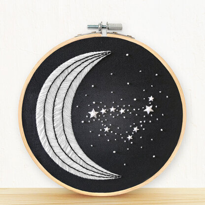 Kit contains: pre-printed fabric, detailed instruction booklet, embroidery needle, felt backing, 6" bamboo embroidery hoop, embroidery floss.