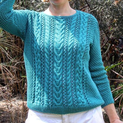 Women's pullover with cable panel on the front and sleeves. The neck band knitted in Garter Stitch.