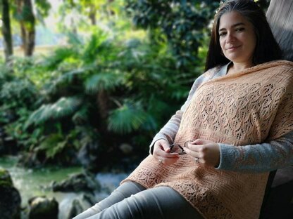 This shawl is knit from tip to tip. You knit the leaf border, then slip one stitch and make an increase (on each row). The body of the shawl has a textured stitch section, a lace section, a textured stitch section and ends with a large lace
