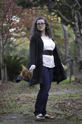 Emeraude is a top down long-line cardigan with lace stripes and an asymmetrical handkerchief hemline. The sweater is knit flat from the top down using raglan increases. Unlike a regular raglan sweater, the increases do not end at the sleeve separation but continue down the body of the cardigan to create the handkerchief hemline.