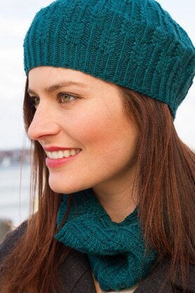 This 3-piece set features accessories with a twisted-stitch motif reminiscent of pine cones. The cowl may be worked as a snug-fitting neck warmer, or a longer version that can be wrapped around the neck. The mittens have stockinette palms and gusset thumbs for a snug fit. The tam is worked with concentric decreases at the crown for an interesting and pretty pattern.